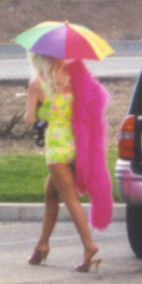 covering her face, colored gores clashing with the short Easter colored